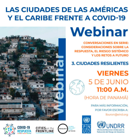 Webinar: "Las ciudades de las Américas y el Caribe frente a COVID-19. Ciudades Resilientes" organizado por la Oficina de las Naciones Unidas para la Reducción del Riesgo de Desastres, el Programa de Naciones Unidas para el Desarrollo, Global Resilient Cities Network, and Cities on the Frontline.