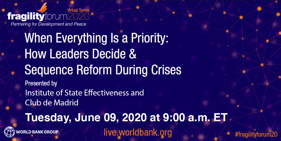 This event will combine insight from the Institute for State Effectiveness (ISE) and the World Leadership Alliance-Club de Madrid (WLA-CdM) to examine how leaders at moments of crisis decide and sequence reforms.